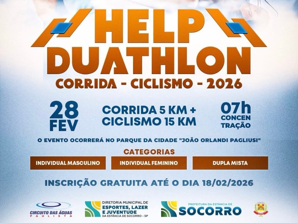 A Estância Turística de Socorro será palco, no dia 28 de fevereiro de 2026, do Help Duathlon, evento esportivo promovido pelo Departamento de Esportes, Lazer e Juventude. A competição, que reúne corrida e ciclismo, será realizada no Parque da Cidade João Orlandi Pagliusi e passa a integrar oficialmente o calendário esportivo do município.
